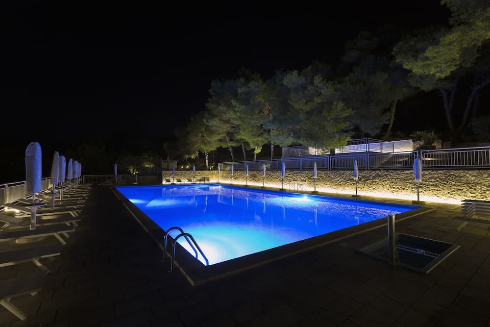 • SPA: il piccolo e suggestivo Centro Benessere, situato all’interno dell’hotel, è completo di piscina scavata nella roccia con idromassaggio, bagno turco, docce emozionali, percorso Kneipp, cascata cervicale, cabine massaggi e zona relax con tisaneria. Possibilità di massaggi anche all’aperto, in gazebo posizionato in pineta vista mare. 1 percorso benessere (45 minuti) incluso per soggiorni superiori alle 4 notti in tutti i periodi. L’ingresso al centro benessere è consentito ai maggiori di 16 anni. La SPA può essere prenotata in esclusiva per la coppia, con prosecco e frutta.