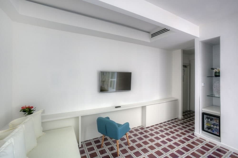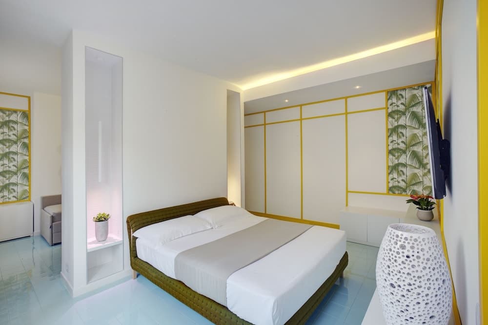 DELUXE CON TERRAZZA: unico ambiente da 2 a 4 posti letto, con terrazza da 160 mq vista mare e vasca da bagno in camera, 2 accappatoi, teli mare e parcheggio riservato, con supplemento da applicare sulla tariffa della Superior Vista Mare Parziale.