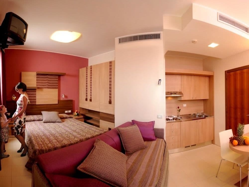 200 camere hotel e 280 residence direttamente sul mare. Le camere hotel si suddividono in camere Classic, Family e Premium Plus. Nelle camere vige il divieto di fumo; è consentito fumare sui balconi. Su richiesta possibilità di camere comunicanti e per diversamente abili.CAMERA CLASSIC - Dotate di aria condizionata con regolazione individuale, TV con Sky, mini frigo, cassaforte, bagno. Disponibili Classic Sea View, con balconcino vista mare, o con balcone (alcune sono senza balcone). Le camere quadruple hanno il 4° letto a castello.